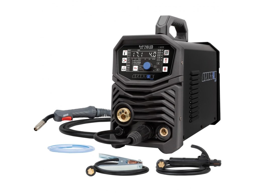 SPARTUS® EasyMIG 210LED je kompaktný a ľahký 3v1 invertorový zvárací stroj s LED displejom. Umožňuje zváranie metódami MIG/MAG, MMA a TIG (Lift TIG) s maximálnym prúdom až 200 A. Ideálny pre začiatočníkov aj profesionálov na údržbu a montážne práce v dielni či teréne.